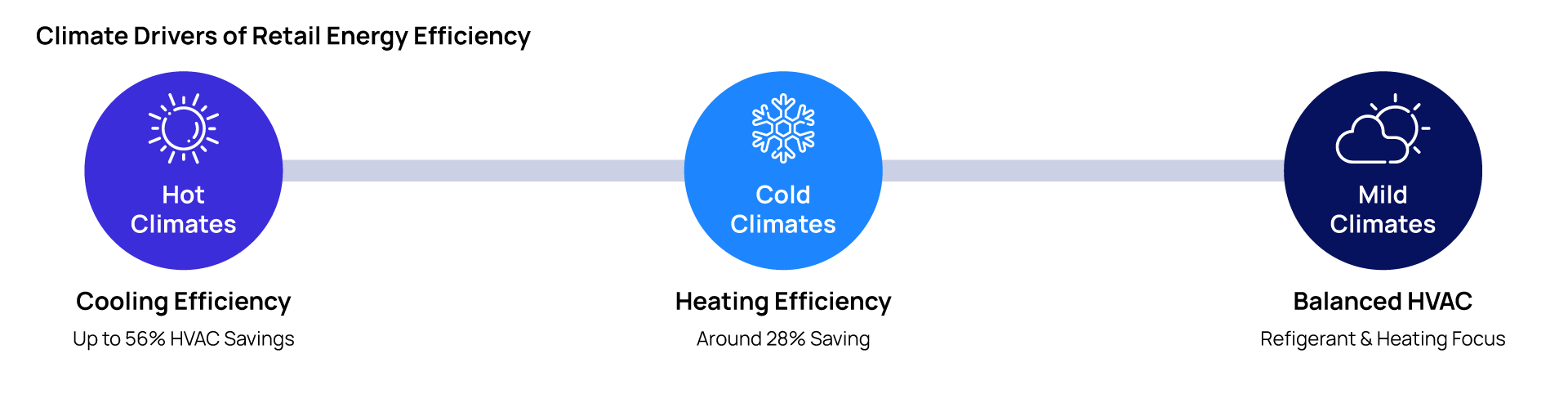 Figure 4. Climate impact on retail energy efficiency shows energy priorities for hot, cold, and mild climates, including cooling efficiency, heating efficiency, and balanced HVAC management.